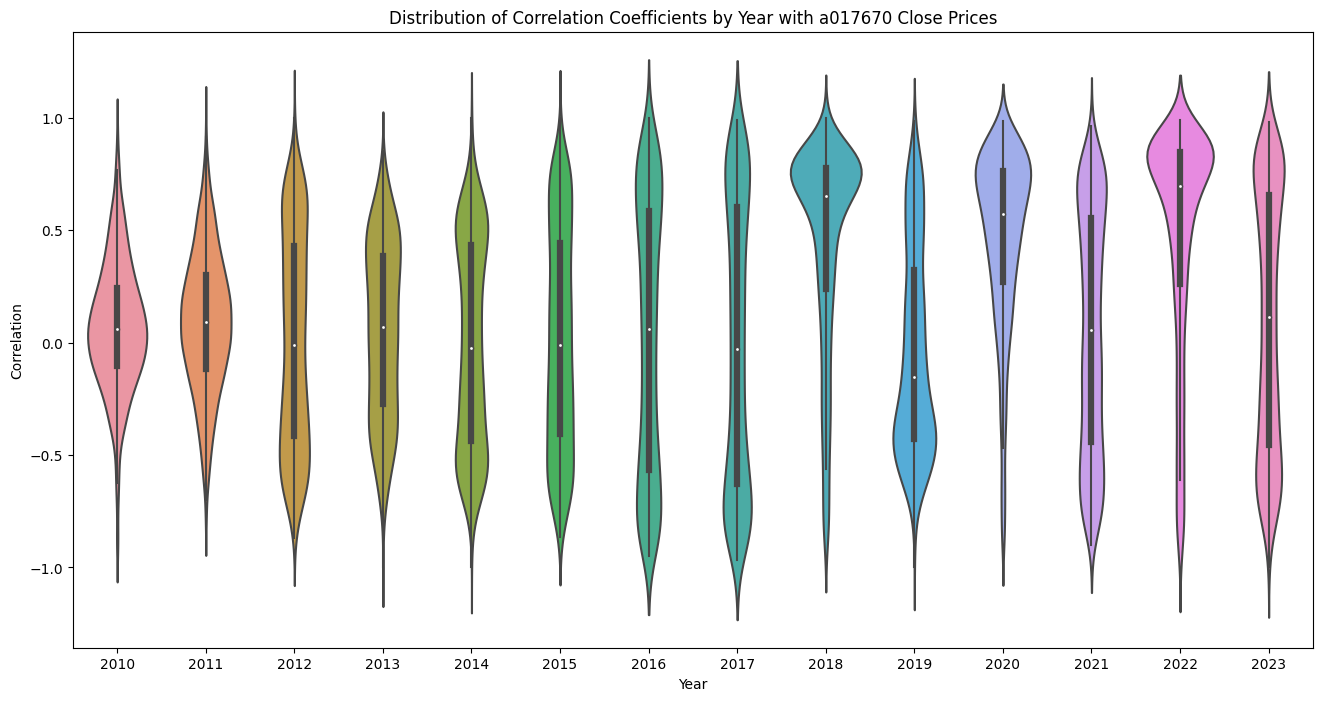 SK텔레콤 Distribution of Correlation Coefficients by Year with a017670 Close Prices 본문