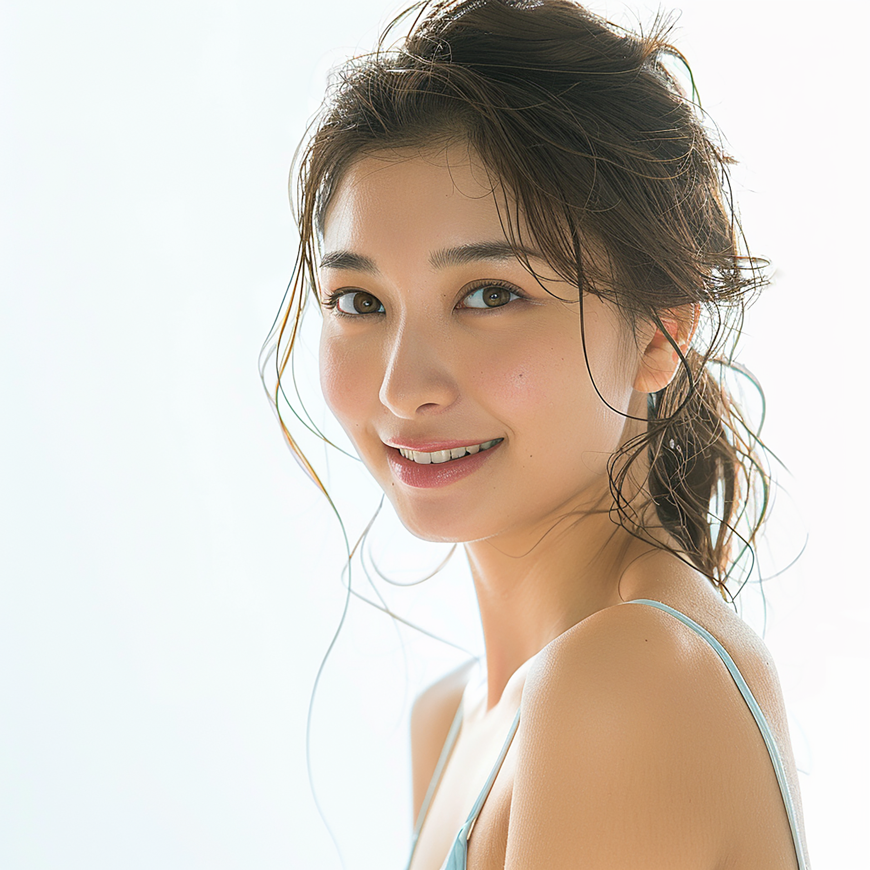 portrait of Smiling japanese Woman super model posing wearing swimware on white background, in the style of depictions of Studio Room and stuio lighting, layers and lines, photography --v 6.0 --s 50 --style raw