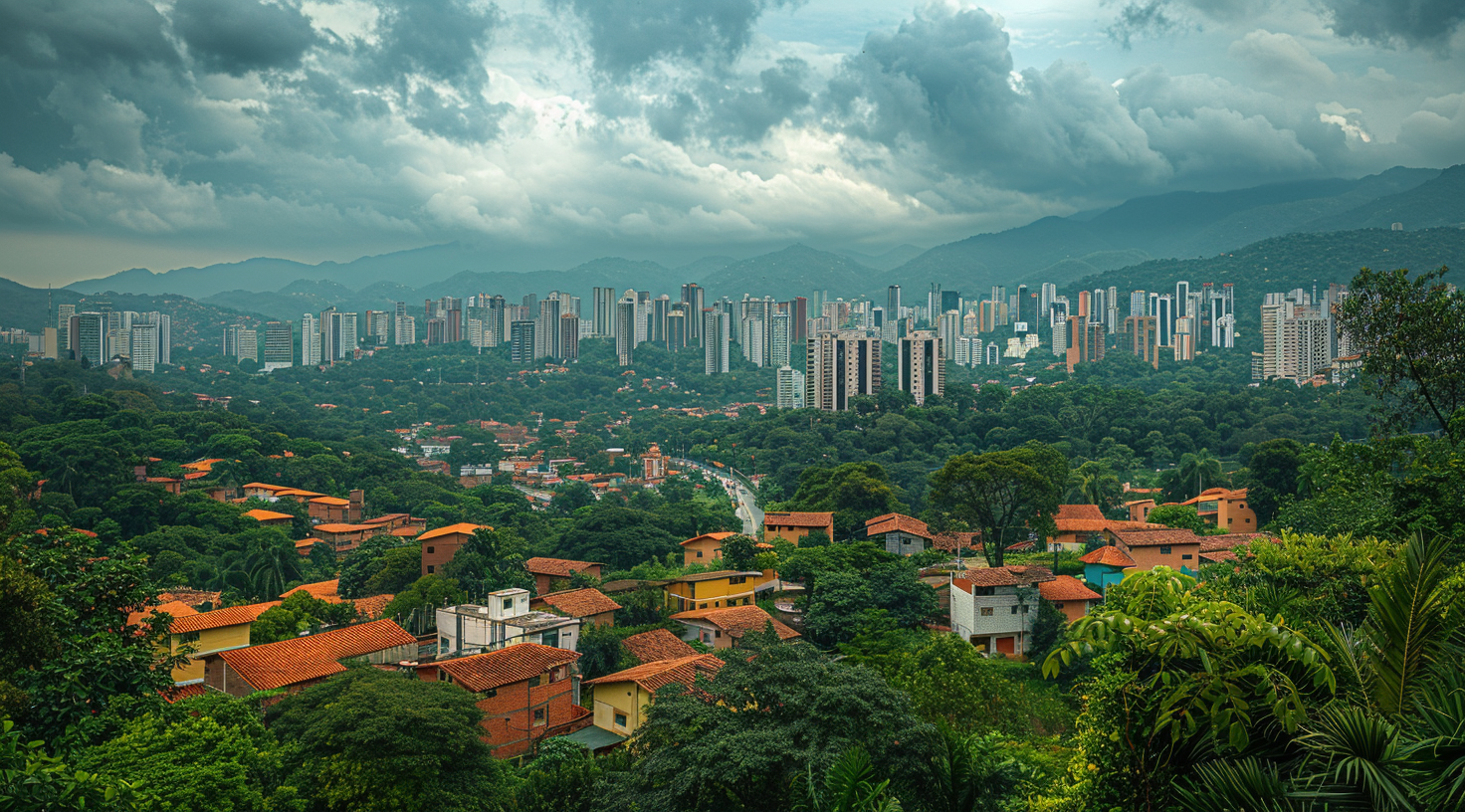 A panoramic view of the cityscape from a crepe, showcasing its skyline and surrounding greenery against a cloudy sky. The buildings stand tall with modern architecture, while small houses line streets below on hillsides covered in lush trees. In the distance behind them is an urban park under mountains, adding to the overall sense of scale and depth. This scene captures one side of Brazil's vibrant cities, highlighting their unique blend of nature and human structures in the style of modern architecture. --ar 128:71 --v 6.0 --style raw --s 250